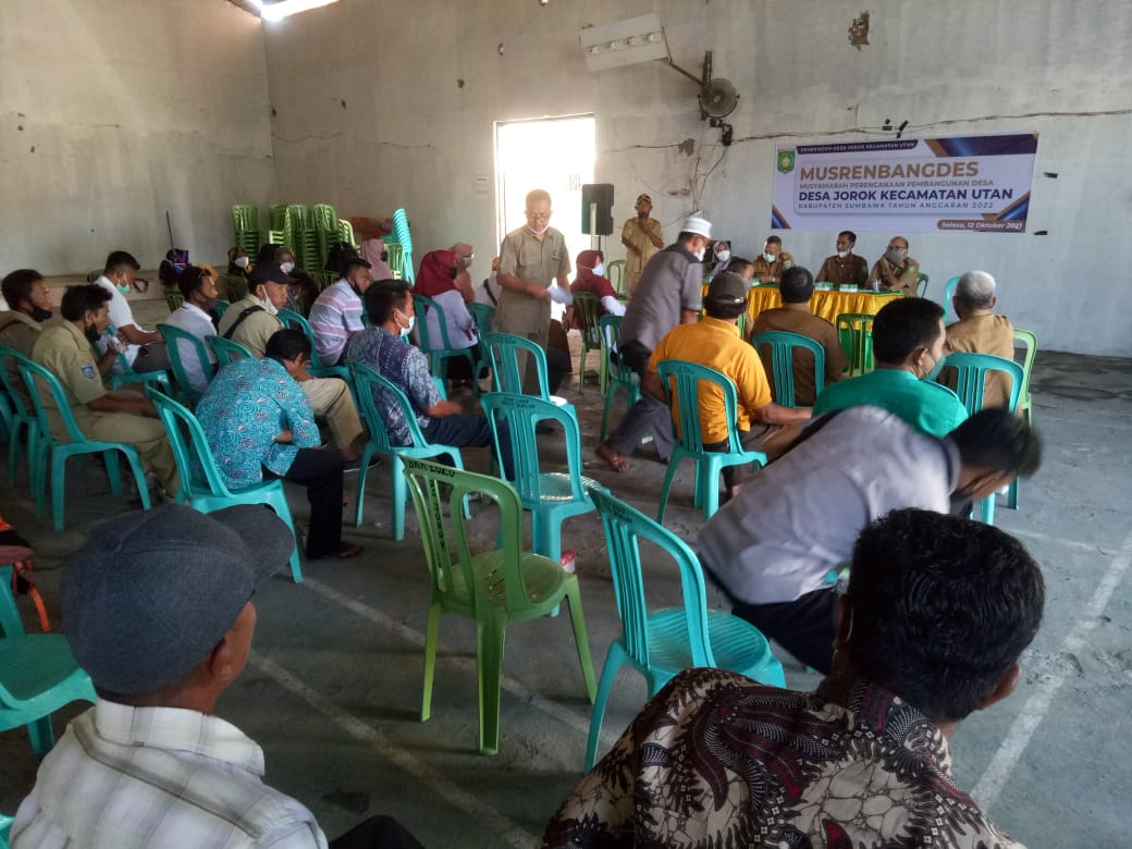 Dalam kegiatan yang dihadiri oleh unsur Pemerintah Desa dan Tim Pembina dari Kecamatan yang dipimpin oleh Bpk Camat Sendiri, BPD, pengurus lembaga kemasyarakatan Desa, tokoh masyarakat, tokoh pemuda, unsur perempuan, tidak ketinggalan Pendamping Desa dan juga stakeholder terkait, Hasanuddin selaku Sekretaris Desa memaparkan bahwa kegiatan-kegiatan yang sudah dianggarkan di tahun 2021 ini belum semuanya terealisasi, hal ini dikarenakan adanya perubahan aturan dan instruksi dari Pemerintah terkait dengan Refocusing anggaran, sehingga kegiatan-kegiatan dimaksud menjadi prioritas kegiatan di tahun 2022 nanti. Selain itu, dalam penyusunan program kegiatan juga mempertimbangkan rekomendasi hasil Indeks Desa Membangun (IDM) Tahun 2021 yang Desa Jorok masuk dalam kategori Desa Maju.